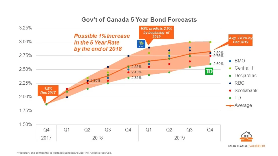 Desjardins economics made a dramatic change to their forecast of 5-year government bond rates while others made only minor adjustments to their forecasts. Desjardins had forecast a steep rise in the 5-year rate in 2018, but has now moderated their forecast and fallen in line with the predictions made by the large Canadian Banks. Still, RBC Royal Bank predicts almost a full 1% increase in the 5-year rate by the end of 2018.