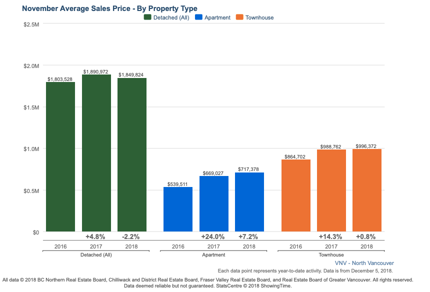 It’s true, there are fewer Condos and Houses selling in 2018 when compared to the last 3 years, down 25% and 55% respectively since 2015, consistent with the broader Metro Vancouver area. On a month to month basis, November saw 2.5% fewer condo sales in North Vancouver than in September, a much better performance than the Greater Vancouver condo market, which saw a 17% slump in October.